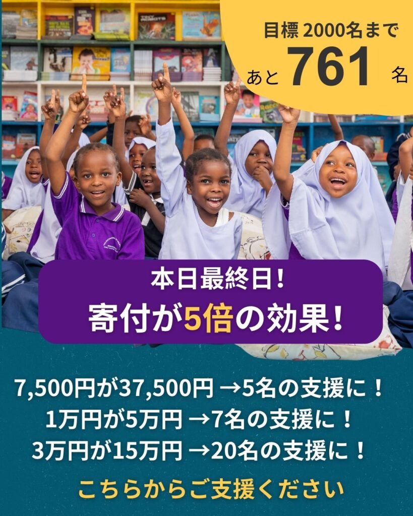 残り761名分の教育支援を一緒に達成しませんか?本日まで、寄付の効果が5倍です!