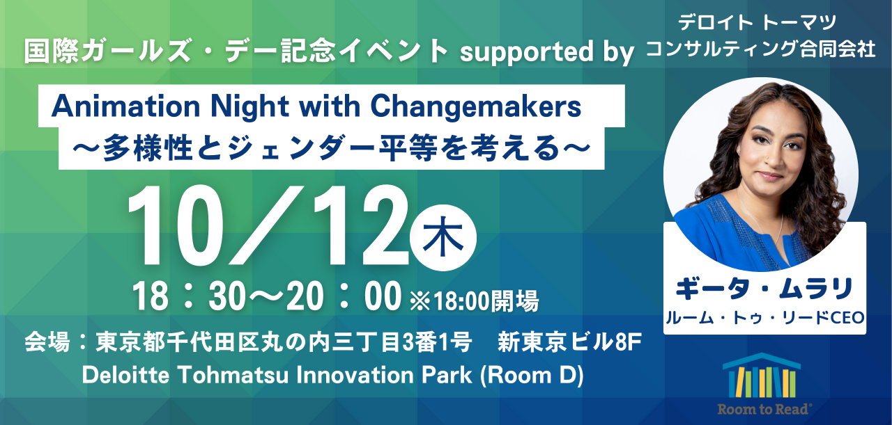 10月の国際ガールズ・デーを記念して、ルーム・トゥ・リードCEOのギータ・ムラリが登壇する対面イベントを、アライアンスパートナー「デロイト トーマツ コンサルティング合同会社」様のご支援のもと、開催いたします!今回のイベントは、NYトライベッカフェスティバル公式セレクション作品にも選ばれた作品「She Creates Change(少女達が未来を変えていく)」とパネルディスカッションを中心に、盛沢山の内容でお届けします。実に5年ぶりのCEO来日、そして4年ぶりの対面イベントです!ぜひご参加ください。