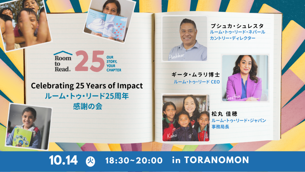 「Celebrating 25 Years of Impact ~ルーム・トゥ・リード25周年 感謝の会~」は、いつもルーム・トゥ・リードの活動へのあたたかいご支援とご協力をいただいております皆さまへの感謝の気持ちを込めてご招待という形で開催いたします。ささやかなご用意となりますが、当日は皆さまと心温まるひとときを過ごせましたら幸いです。