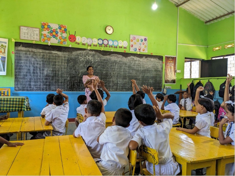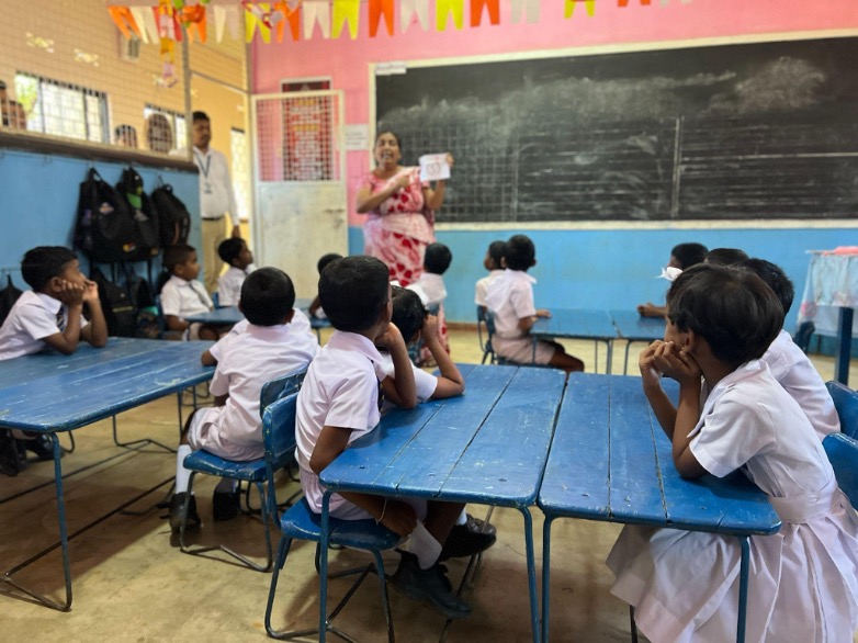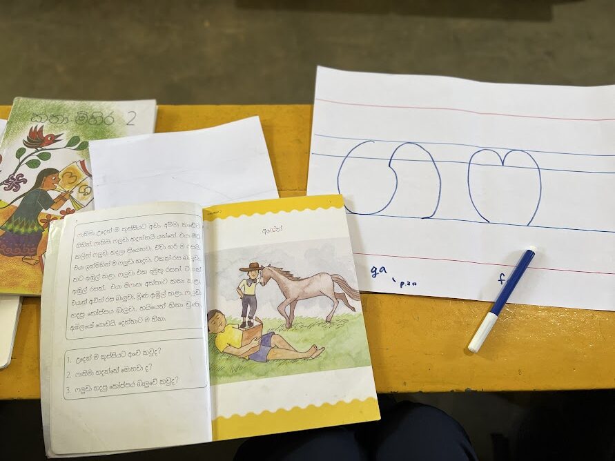 1年生のシンハラ語の授業では、音から文字を学んでいました。先生はまず、子どもたちに音を聞かせてリピートさせます。次に、絵の描かれたカードを使い、特定の音が聞こえたらその音を使う絵の描かれたカードを手に取るというゲーム感覚の授業を行っていました。最終的にルーム・トゥ・リードが出版した書き取りノートで文字を書き順通りに書く練習へと進んでいました。授業の雰囲気は、活気に満ちている印象を受けました。先生は絶えず子どもたちに問いかけ、子どもたちはその問いに答えようと、勢いよく手を挙げていたのが印象に残っています。