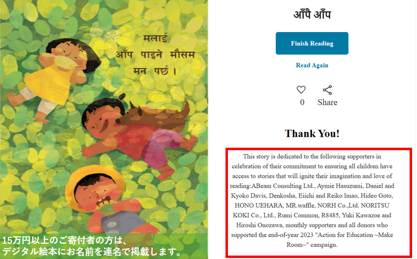 ・150万円:デジタル児童書に、ご希望のお名前を単独で記載いたします。